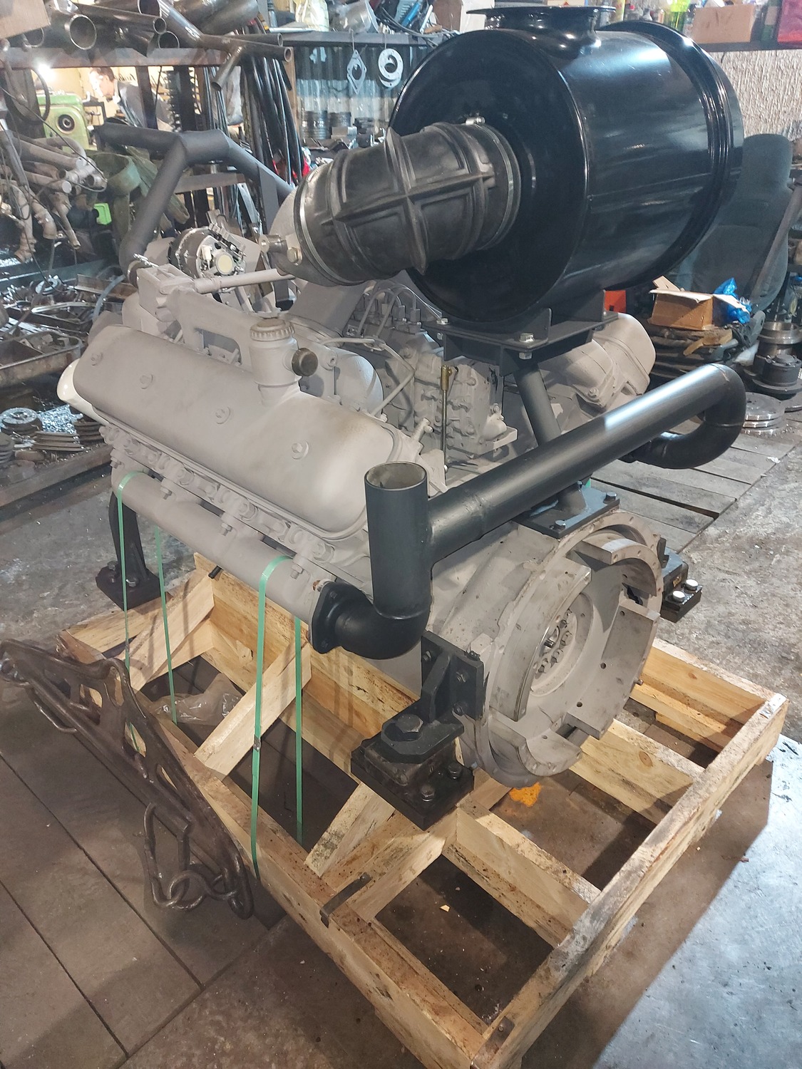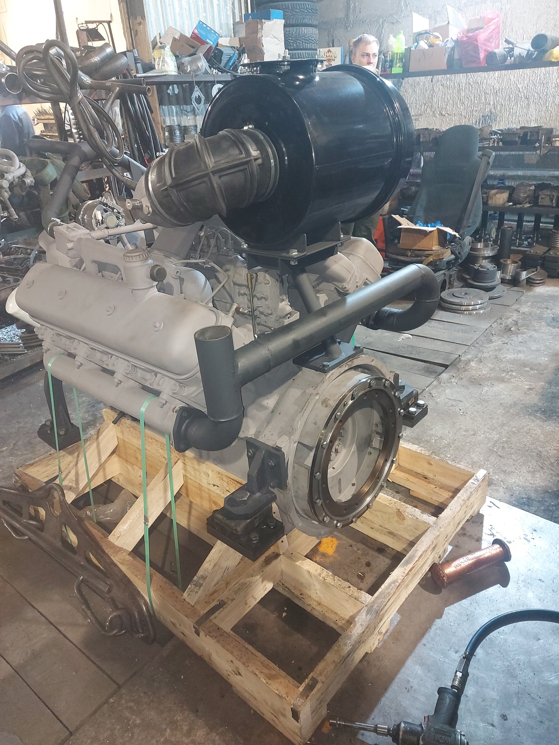 В процессе изготовления монтажного комплекта нам необходим двигатель ЯМЗ на нашей производственной базе для его доработки и частичной обвески монтажным комплектом. Детали монтажного комплекта, которые мешают погрузки-разгрузки двигателя и его перевозки укладываются в отдельный транспортировочный ящик.